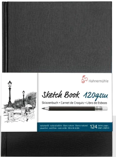 O caderno de esboços Hahnemühle Sketch 120 é ideal para desenhos com lápis, carvão ou ocre vermelho. Com uma capa dura preta texturizada, isso protege efetivamente o conteúdo do caderno de esboços. Os papéis brancos naturais semi-ásperos fornecem bons contrastes e cores vibrantes podem ser facilmente obtidas.